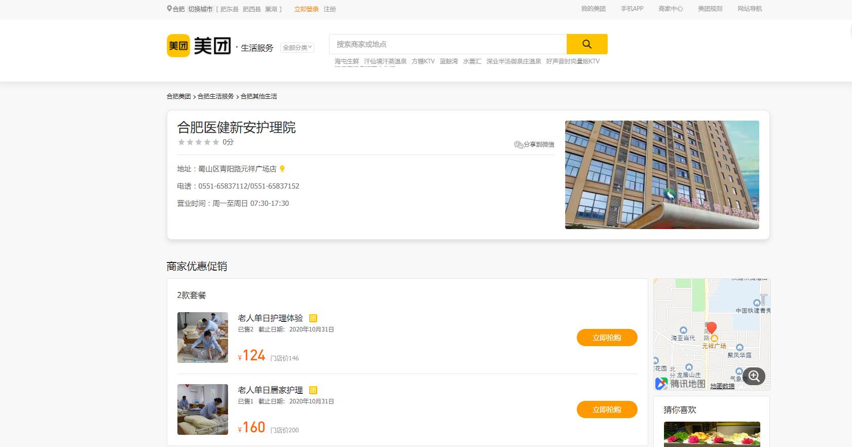 1.打开美团APP→搜索“护理”或医健新安护理院→点击进去页面如下: