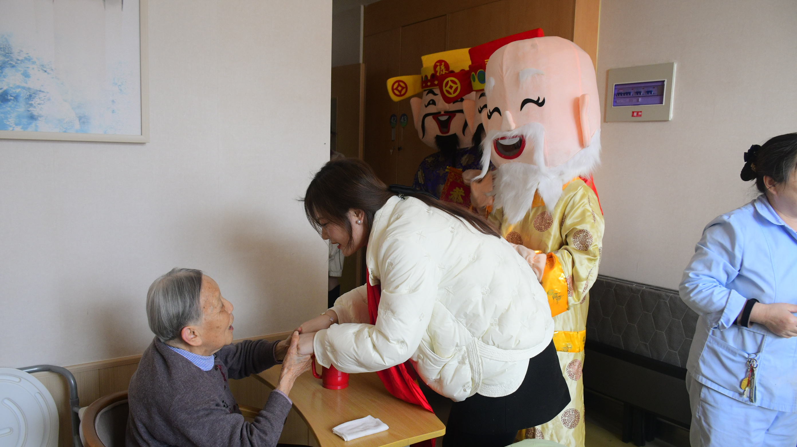 红包抽奖、福禄寿拜年、才艺表演等环节,让整个护理院沉浸在一片欢声笑语中。红包抽奖环节,家属们只需关注公众号,就有机会赢取丰厚的奖品。而“福禄寿”的突然造访,更是给长者们带来了惊喜与欢乐。他们可以和“福禄寿”合影留念,记录下这美好的时刻。
