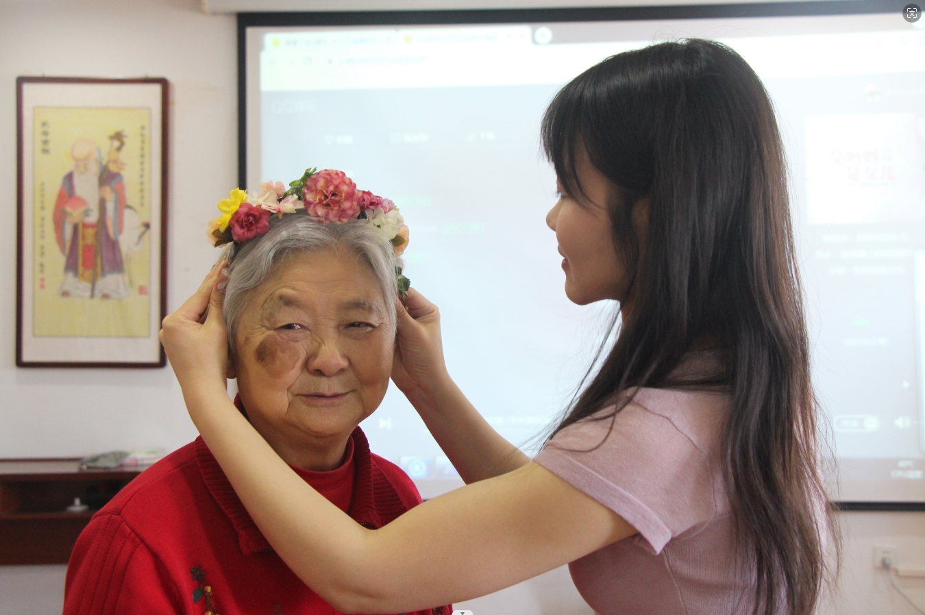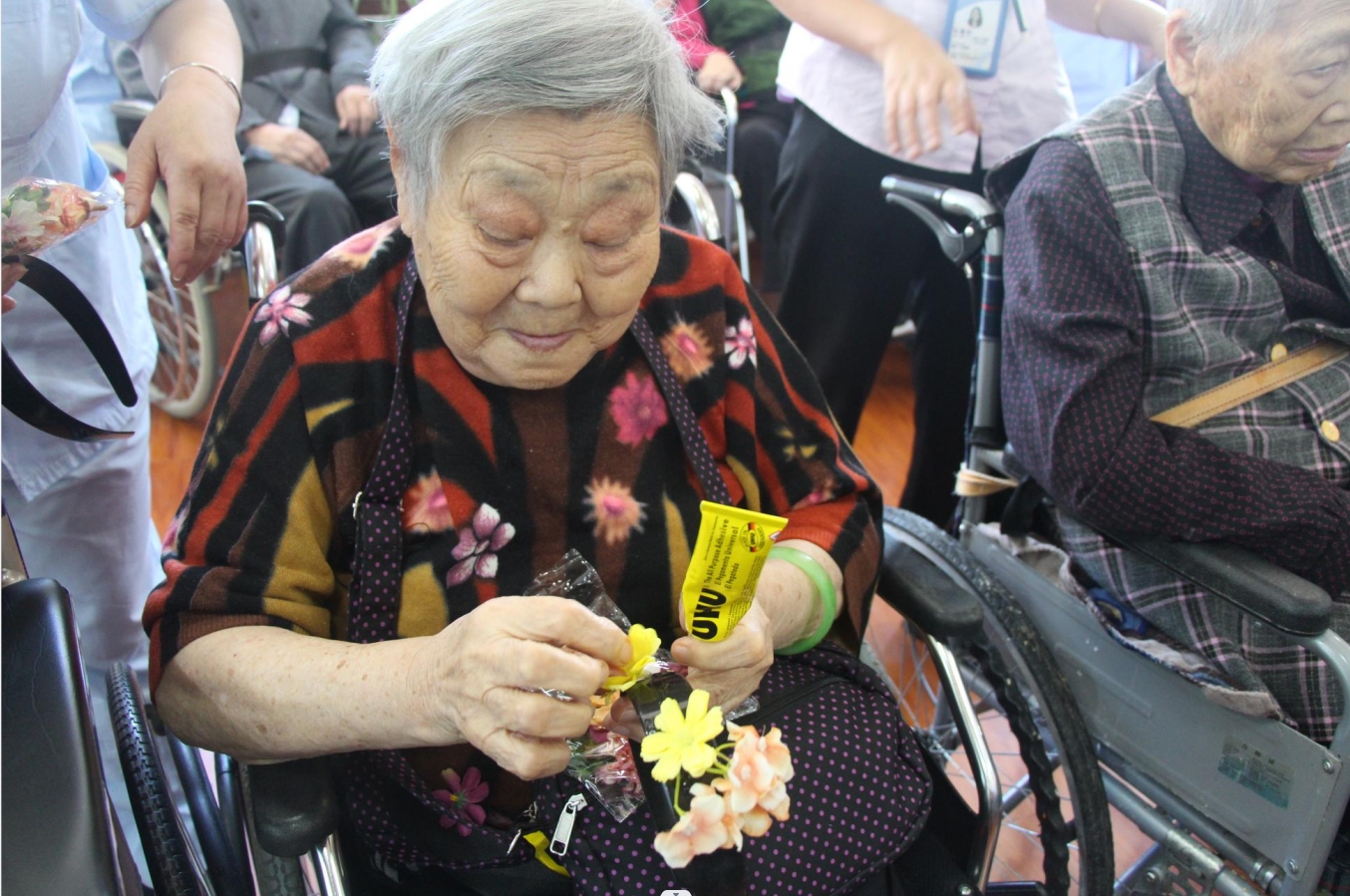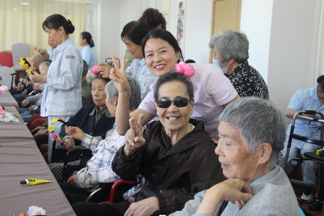 在工作人员和护理员的耐心指导下,长者们仿佛变身为技艺高超的工匠,巧手翻飞,将一朵朵娇艳的花朵细心地粘贴在发箍上,仿佛将春天的美好和温暖永远地留在了银发之间。