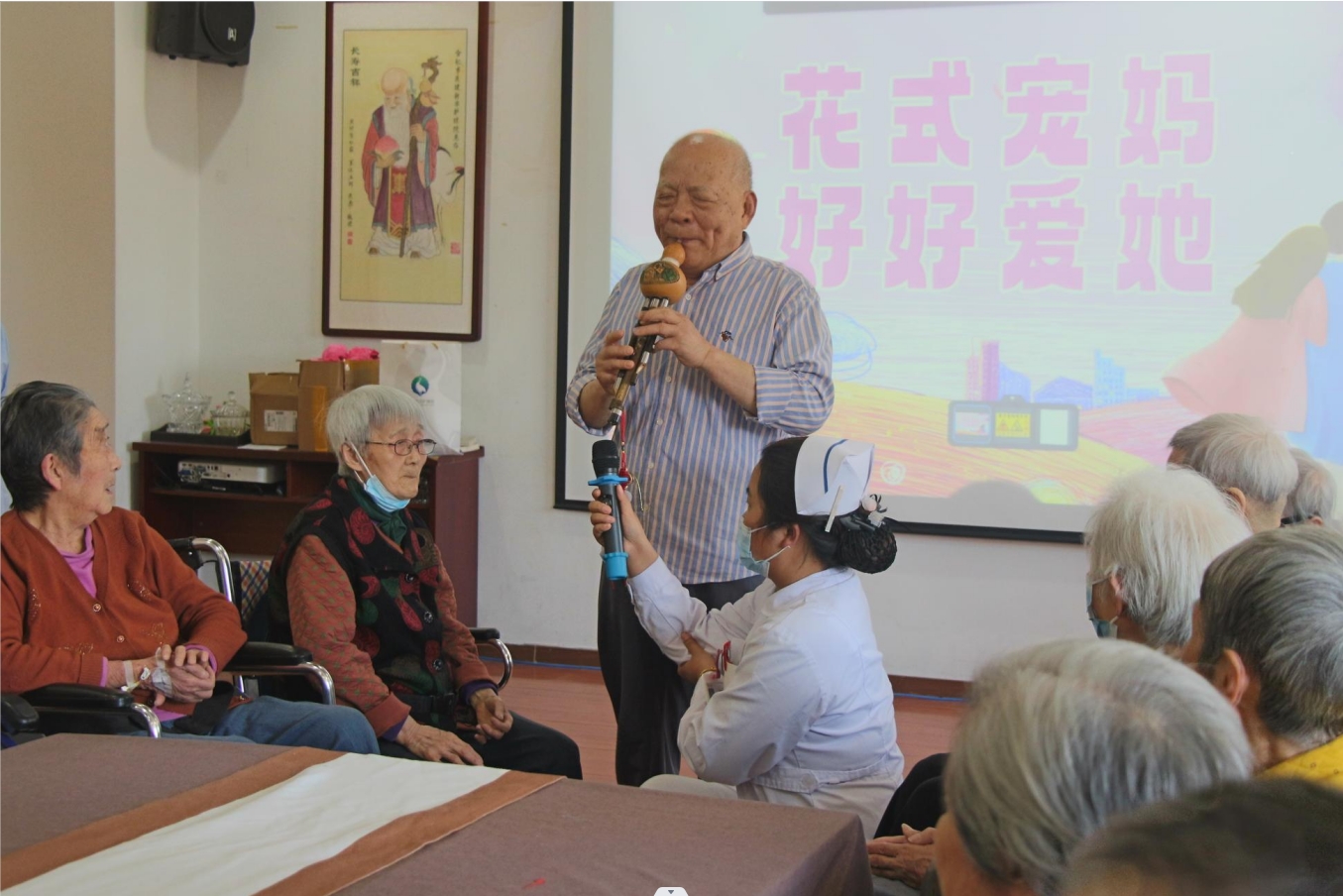 活动伊始,院内的方爷爷作为男性代表,满怀敬意地走上舞台,为在座的每一位母亲送上了温馨的节日祝福。他的话语温暖人心,仿佛春风拂面,让在场的每一位母亲都感受到了节日的喜悦和温暖。随后,他更是精心准备了一场精彩的葫芦丝演奏和歌曲表演,为活动增添了浓厚的艺术氛围。在这美妙的音乐声中,母亲们纷纷沉浸在幸福的海洋中,享受着这份特别的节日礼物。